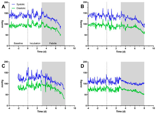 Loss of blood pressure during the febrile period. Graphs shown data for systolic (blue) and diastolic (green) blood pressure recorded by telemetry from four individual macaques (A–D) across all dose ranges. Gray bars on each graph mark the febrile period.