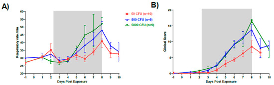 Changes in respiration and clinical score after infection. Graphs show changes in (A) average respiration rate and (B) average clinical score for each dose group. Gray bars on each graph mark the febrile period.