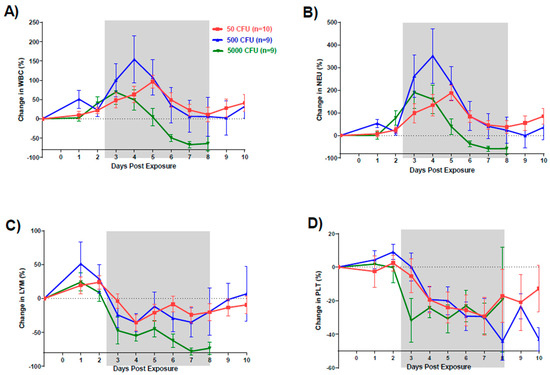 Changes in white blood cells after infection (suggested). Graphs show changes in average cell counts by dose group for (A) total white blood cells, (B) neutrophils, (C) lymphocytes, and (D) platelets.