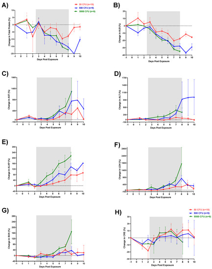 Changes in CBCs and blood chemistries were observed in all groups after exposure to F. tularensis. Similar to our observations in the previous published study, WBC counts increased starting Day 2 for the high and low dose group and Day 3 for the intermediate dose group (Figure 6). Decrease in total protein and albumin (ALB) values observed by Day 3 (Figure 7A,B). There were no significant differences in total protein between the three groups. In contrast, albumin values were significantly lower in the intermediate (p = 0.0003) and high dose groups (p = 0.0014) compared to the low dose group. In addition, both intermediate and high dose group values were significantly lower than the normal range (p < 0.05). Liver enzymes aspartate transaminase (AST), alanine transaminase (ALT), and alkaline phosphatase (ALKP) were elevated in all groups (Figure 7C–E). Pairwise comparisons showed significant differences between the low and high dose groups for AST, ALT, and ALKP (p = 0.0062, p = 0.0118, and p < 0.0001, respectively). The greatest increases outside of the normal range were observed in elevated ALKP values for the high dose group on Days 6 (p < 0.001), 7 (p < 0.01) and 8 (p < 0.001). Levels of LDH (lactate dehydrogenase) increased starting on Day 4 for all groups with the high dose group showing the greatest increases in comparison to the low dose group (p = 0.0385) (Figure 7F). Except the highest dose group, blood urea nitrogen (BUN) levels stayed in normal limits; similarly, creatinine (CRE) levels remained within a low/normal range (Figure 7G,H).