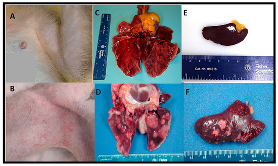 Comparison between nonchallenged control cynomolgus macaques and the gross pathological changes noted in cynomolgus macaques exposed to aerosolized F. tularensis. (A) Axillary area with no evidence of a cutaneous rash. (B) Axillary area of NHP exposed to 5000 CFU. (C) All lung lobes appear grossly normal with the exception of postmortem congestion. (D) Lung from a cynomolgus macaque exposed to 5000 CFU SCHU S4; hemorrhagic, edematous, and noncollapsing lung with multiple, raised necrotizing, and/or pyogranulomatous foci on all lung lobes. (E) Normal sized and shaped spleen. (F) Spleen from a cynomolgus macaque exposed to 50 CFU; multiple, tannish-white, flattened to slightly raised foci.