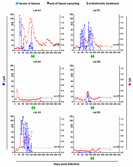 Five of the six cats (A1–A3, B1–B2) exceeded the cut-off value of 0.166 optical density (OD) during the study (Figure 1). Seroconversion occurred between day 21 and 118 pi and lasted for various periods. Interestingly, cat A2 remained copromicroscopically negative throughout the study, but showed the earliest, albeit shortest, seropositivity from day 21 to 28 pi. A short period of seropositivity, corresponding to quantifiable LpG values, was also observed in the cat with the latest onset (cat B2, days 118–154 pi). Similarly, in cats A1, A3 and B1 seropositivity correlated, with some time lag, in its course and OD levels with the respective LpG levels. In cat A3, seroconversion was evident five days before the first larvae detection on day 47 pi, while cats A1, B1 and B2 turned seropositive 16–85 days after the first larvae detection. In cat B3, the OD values never exceeded the cut-off despite positive Baermann results. However, this cat excreted very low numbers of L1, reaching a maximum of 0.5 LpG only.