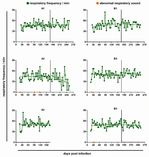 In all cats, the respiratory frequency remained without significant changes during the observation period (Figure 2). However, there was a pronounced decrease in the respiratory frequency after anthelmintic treatment in cat A2, even though this individual was never found positive on the Baermann’s test.