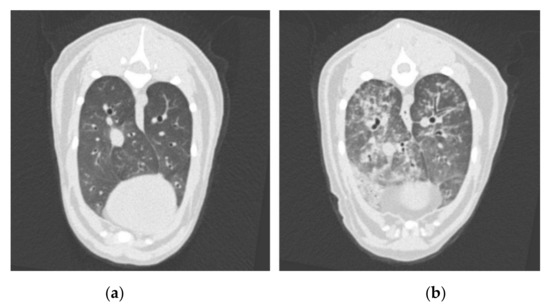 Transverse thoracic computed tomography (CT) images at the level of the caudal lung lobes showing (a) an unremarkable lung pattern scored as 0, and (b) a significantly altered lung pattern of an A. abstrusus-infected cat given a score of 3.