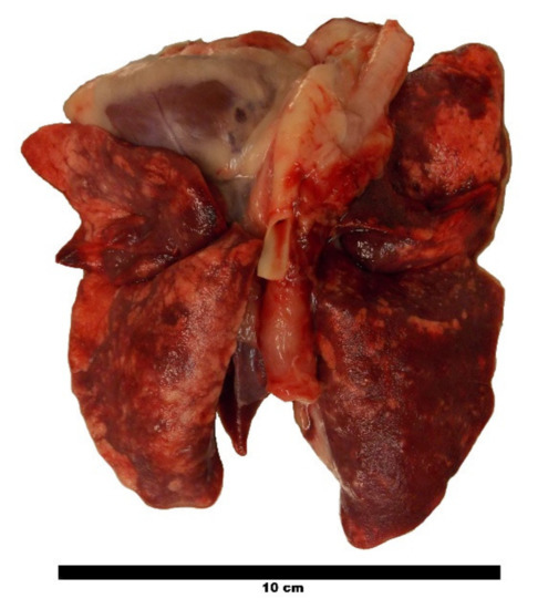 Lungs of cat A3 deceased 168 dpi. The parenchyma of the lungs is interspersed with nodular areas of consolidation, emphysema and firm nodules protruding over the surface of the lungs.