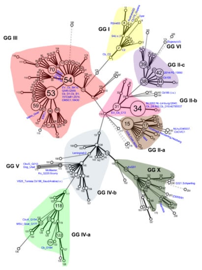 Finally, we visualised the metadata associated with the MLVA database by colouring the minimum spanning tree (Figure 1) according to various attributes such as predicted genomic group, associated MST genotype or host and geographical isolation source. As seen in Figure S2b–d, the cluster of MLVA genotypes assigned to GG III corresponded to the MST20 genotype, which was associated mainly with cattle from Europe. A cluster of MLVA genotypes assigned to GG II-b corresponded to the MST33 genotype, which was dominated by human and goat isolates from the Netherlands and other regions of Europe. The cluster of MLVA genotypes assigned to GG IV-a contained MST8 and related genotypes that were isolated from sheep, goats or humans. The cluster of MLVA genotypes assigned to GG IV-b was represented by MST genotypes 1–7 and predominantly included isolates from humans.