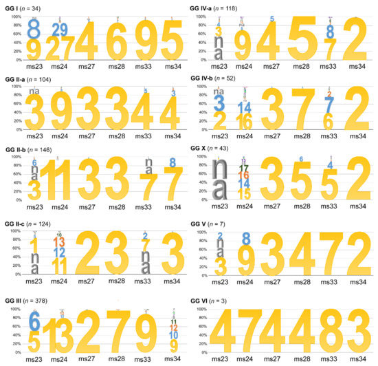 Next, we used diversity index calculations to corroborate our assignment of MLVA genotypes into genomic groups. For this, we looked for a reduction in diversity as an indicator of categorisation. A graphic view of the resulting indices is shown in Figure S1. The diversity indices of combined database entries was between 0.62 and 0.87, whereas the indices for ten loci within genomic groups were zero, confirming uniformity. When comparing the VNTR profiles between genomic groups, we found unique, identifying repeat numbers for at least one locus for each genomic group, as well as hyper-variability in other loci (see Figure 2). All GG II entries had a repeat number of 3 for the ms28 locus, and subgroups a-c were clearly distinguishable at either the ms27 locus (a repeat number of 2 identifies GG II-c) or the ms34 locus. GG III can be identified at locus 27 (repeat number 2 in 99.7% of entries) and locus 28 (repeat number 7 in 98.3% of entries), as well as either 5 or 6 repeats at the ms23 locus. GG IV as a whole is characterised by two repeats at the ms34 locus, whereas subgroups could be identified through the combination of repeat numbers at loci ms27 and ms28.