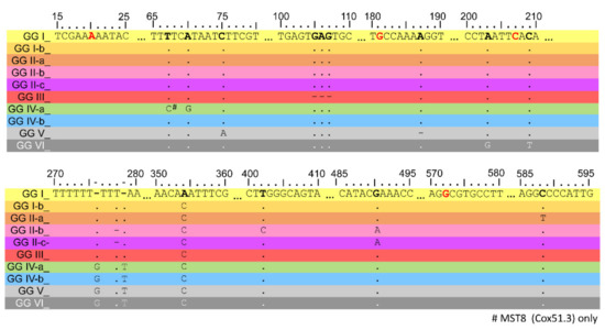 Genomotyping SNP scheme for the Cox51 spacer region. Sequences for each genomic group were aligned and SNPs relative to the Nine Mile RSA493 reference genome belonging to GG I are shown. Dots represent no change, whereas dashes represent a deletion. Unique, identifying SNPs were found for GG I, I-b, II-a, II-b, III, IV-a, V, and VI. GG II-c and d are indistinguishable from each other, but can be distinguished from GG II-b by the absence of a SNP at position 403. GG IV-b can be deduced by the presence of the common GG IV-VI insertions (pos 276 and 278) without the presence of the identifying SNPs for GG IV-a, V, and VI. Nucleotide positions where SNPs have occurred in isolates that were not conserved within a genomic group are highlighted in red. Note that GG IV-b includes GG IX and GG X (MST30 and MST-Aust).