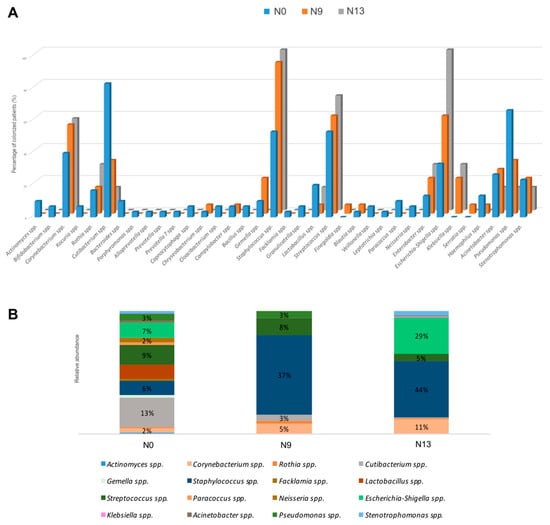 The most abundant bacterial communities of nasal swabs from newborns at time of birth and after two follow-ups. Results were obtained by NGS. (A) Percentage of colonized patients for each genus; (B) mean of bacterial relative abundances for each group. N0: samples collected at time of birth. N9: samples collected after 9 days of permanence in NICU. N13: sample collected after 13 days of permanence in NICU.