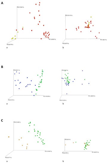 Emperor PCoA plot generated from the jackknifed_beta_diversity.py script of QIIME. Unweighted (a) and weighted (b) UniFrac-based PCoA, each dot represents a sample. (A) N0 vs. DR. N0 (red), DR (yellow). N0: nasal swabs collected at time of birth. DR: environmental samples from the Delivery Room. (B) N9 vs. NICU. N9 (blue), NICU (green). N9: nasal swabs collected after 9 days of permanence in NICU. NICU: environmental samples from the ward. (C) N13 vs. NICU. N13 (orange), NICU (green). N13: nasal swabs collected after 13 days of permanence in NICU.