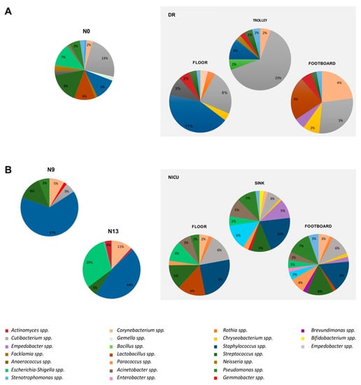 The predominant bacterial communities of nasal swabs from newborns in comparison with the environmental ones. Results were obtained by NGS. Data are expressed as mean relative abundance values. (A) N0 vs. DR. N0: nasal swabs collected at time of birth; DR: environmental samples of delivery room divided into type of surface (floor, footboard, and trolley). (B) N9 and N13 vs. NICU. N9: samples collected after 9 days of permanence in NICU. N13: sample collected after 13 days of permanence in NICU; NICU: environmental samples of NICU divided into type of surface (floor, footboard, and sink).