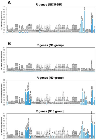 Resistome characterization of the microbial population contaminating NICU surfaces. Results were obtained by qPCR microarray as described in Methods and are expressed as log10 fold change of each detected R gene, compared with the negative controls (NTC). The plotted data represent the mean values of duplicate samples obtained in two environmental samplings for NICU environmental duplicate sampled points (A) and for nasal swabs of N0, N9, and N13 newborn groups (B).