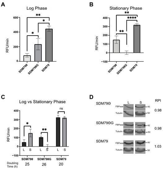 FBPase activity is influenced by extracellular glucose and cell density. FBPase activity was measured in PF 2913 cells grown in SDM79Θ, SDM79ΘG, and SDM79. (A) Bar graph of FBPase activity in cells grown to log phase (5 × 106/mL) in each of the described media conditions. (B) Bar graph of FBPase activity in cells grown to stationary phase (1 × 107/mL) in each of the described media. (C) Bar graph of FBPase activity comparing same media. Log (black bars) vs. stationary phase (grey bars). For all assays, FBPase activity was calculated using three biological replicates performed in triplicate. (D) Western blots of whole cell lysates (log phase, L and stationary phase, S) probed with anti-FBPase and anti-Tubulin used as a loading control. Pixel intensities of FBPase were calculated in FIJI and normalized to Tubulin. Ratios of log phase FBPase pixel intensity to stationary phase FBPase pixel intensity are given as Relative Pixel intensity (RPI). Error bars represent standard deviation. Significance was determined using Student’s t-tests of sample pairs indicated by brackets (* p < 0.05, ** p < 0.01, **** p < 0.0001).