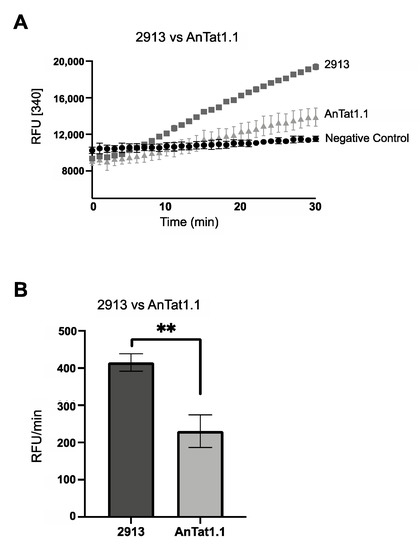 FBPase activity is higher in PF 2913 as compared to PF AnTat1.1 when both are grown in SDM79. (A) FBPase activity in PF 2913 (dark grey squares), PF AnTat1.1 (light grey triangles) and negative control (black circles). (B) Bar graph of FBPase activity (RFU/min) of representative biological replicate performed in triplicate (** p < 0.01, Student’s t-test). PF 2913 (black bar) and PF AnTat1.1 (grey bar).