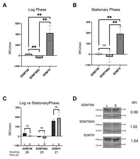 To resolve whether differences in FBPase activity were due to changes in steady state protein abundance, we measured FBPase levels from log phase and stationary phase cultures grown in SDM79, SDM79Θ, or SDM79ΘG using Western blotting and densitometry. FBPase expression levels were highest in SDM79 as compared to SDM79Θ or SDM79ΘG (Figure 3D), with the latter two media yielding similar protein levels. Unlike FBPase enzyme activity, which changed with cell density, protein levels were similar in log and stationary phase cultures.