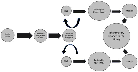 Th2 response is often thought of as being delayed compared to Th1, and for fungus to become infectious the organism needs to germinate and spawn over a prolonged period of time [60]. The CF mucus is likely to be an appropriate environment for this necessary time gap; it is thick, full of nutrients and cell products, warm, and isolated from inflammatory cells [2]. Given that there are concerns about a weak Th1 response to complex eukaryotic organisms, the delayed Th2 response could react to the complex fungal organisms/hyphae. If the Th2 response cannot kill it with the recruitment of eosinophils (basic pH secretions and chemicals), it could possibly promote ‘walling off’ of organisms within the airway. Since this response allows for a complex organism to grow, it thus could create more epitopes and peptides for antibodies and T cells to react to (Figure 1) [60,88].