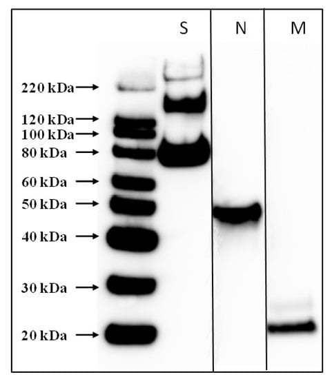 Western blot analysis of purified SARS-CoV-2 PsIV. Presence of SARS-CoV-2 antigens was evaluated by separate Western blots using antibodies specific for spike protein (S), nucleocapsid protein (N), or membrane protein (M). The lanes from the N and M Western blots are shown next to the lanes from the S Western blot. Two distinct bands were observed when spike protein-specific antibodies were used: one for the S protein monomer at 140 Kda and a second band for S1 subunit at 76 Kda.