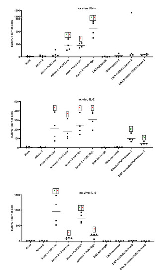 Ex vivo ELISPOT for IFN-γ, IL-2, and IL-4. Mouse splenocytes were used for ELISPOT assays. Data are presented as spot-forming units (SFUs) per 1 × 106 cells. Each symbol represents one mouse, and horizontal lines represent group median values. Student’s t-tests were used to compare differences between groups. * indicates significant differences (p ≤ 0.05) between the adjuvant and PsIV group vs the corresponding adjuvant alone group. ^ indicates significant differences between alum and PsIV (high or low dose) groups vs the corresponding Advax-2 and PsIV dosage groups. > indicates significant differences between the DNA vaccine alone groups vs the corresponding DNA/PsIV prime-boost groups.