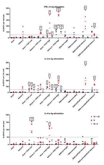 Assays for the cytokines IFN-γ, IL-2, and IL-4 were performed on spleen cells using cytokine kits from Mabtech (Sweden). The kit numbers were 3321M-2H for IFN-γ, 3441-2H for IL-2, and 3311-2A for IL-4. The culture media used was RPMI 1640 supplemented with 10% fetal bovine serum, 50 µM 2-mercaptoethanol, and 1% penicillin–streptomycin. The following antigens obtained from BEI resources were used for the assay: the peptide arrays for the spike protein (S) (cat#NR52402), nucleoprotein (N) (cat#NR52404), membrane protein (M) (cat#NR52403), and envelop (E) protein (cat#NR52405) of the SARS-CoV-2 Wuhan strain. Each individual peptide in the array was dissolved in DMSO, and the arrays were reconstituted into peptide pools with a concentration of 1 mg/mL per peptide. The S protein peptide array contained 181 peptides, so they were made into two stock pools designated as S1 (peptides 1–90) and S2 (peptides 91–181). The remaining three proteins (N, M, and E proteins) were made into one stock pool per protein. Briefly, ELISPOT plates (MAIPSWU10, Millipore) were coated with cytokine-specific monoclonal Abs. The manufacturer-recommended protocols (Mabtech) were used strictly for coating with monoclonal Abs and for developing the ELISPOT plates. After coating the plates and washing, 100 µL/wells of peptide pools were added to the ELISPOT plates. Fresh spleen cells or frozen–thawed spleen cells recovered overnight in culture media (100 µL/well) were immediately added to the wells. The final concentration of peptides in the assay mixtures was 1 µg/mL. The cell concentration for the assays was 2 × 105 cells/well (for IFN-γ and IL-2 assays) or 1 × 105 cells/well (for IL-4 assay). The plates were then incubated at 37 °C in 5% CO2 for about 20 h. Mock controls containing everything except for the peptides were prepared and similarly incubated. After a 20-h incubation, the cells were washed and the assay was developed using the manufacturer-recommended protocol (Mabtech). The spots were counted using an automated spot counter (AID ELISPOT Reader, Autoimmun Diagnostika GmbH, Straßberg, Germany). The spots were then normalized based on input cells per well, and the results are expressed as spot-forming units (SFUs) per 106 cells. Data are presented as direct ex vivo cytokine responses and antigen-stimulated responses. ELISPOT data for IFN-γ, IL-2, and IL-4 from the mock control experiments are shown as ex vivo responses, and antigen-stimulated responses represent the data after subtracting the ex vivo responses from the corresponding antigen-stimulated data.