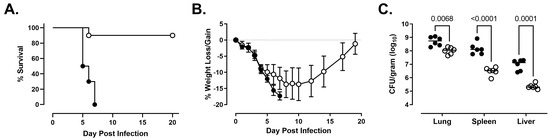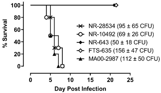 Comparisons of survival curves between different groups were statistically evaluated by Kaplan-Meier and Log-rank (Mantel-Cox) analysis (GraphPad Prism, Version 9.0.1, San Diego, CA, USA). Comparisons of organ bacterial burdens following challenge with the NR-643 or NR-10492 SCHU S4 strain were analyzed by repeated measures two-way ANOVA with Bonferroni’s multiple comparison test.