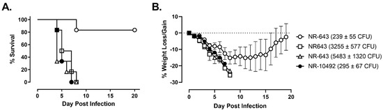 In an additional experiment, groups of F344 rats were infected with increasing doses of NR-643 to measure the level of attenuation compared to NR-10492. The results showed that mortality was dose-dependent, and all rats succumbed to NR-643 infection at a dose of 3255 CFU or higher between day 4 and 8 post-infection (Figure 4A). The clinical presentation and disease progression were indistinguishable between rats challenged with lethal doses of NR-643 or NR-10492 (Figure 4B). Thus, NR-643 appeared to be significantly attenuated compared to NR-10492, but not completely avirulent in F344 rats.