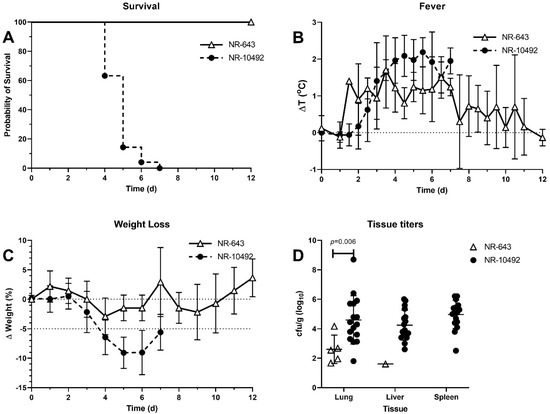 Virulence of NR-643 and NR-10492 in NZW rabbit model of pneumonic tularemia. NZW rabbits were exposed to 54 to 5523 CFU of NR-643 (n = 5) or 83 to 53,000 CFU of NR-10492 by aerosol inhalation. A total of 53 rabbits have been exposed to NR-10492, of which 30 were at a dose ≤5000 CFU. The graphs summarize studies performed over 10 years and include five rabbits infected with NR-643 and 53 infected with NR-10492. (A) survival out to 12 days after infection; (B) averaged twice daily body temperatures after infection plotted as change from baseline; (C) averaged daily change in weight after infection; (D) bacterial burden in lung, liver, and spleen at necropsy. Error bars show SD.