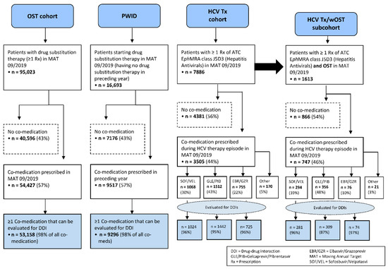 For three patient cohorts and a subgroup of one of the patient’s cohort, all co-medications were compiled for the defined periods, and, in a second step, they were examined for potential drug–drug interactions (DDIs) with regard to state-of-the art direct acting antivirals (DAAs) in HCV therapy. Described in more detail below, these cohorts were categorized as OST cohort, PWID (without OST), HCV treatment cohort (Tx cohort) and, a subgroup of the latter, as the HCV treatment cohort with OST (HCV Tx/wOST cohort).