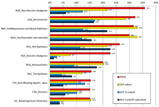 Since PWID and patients on OST are often affected by physical and mental health disorders, polypharmacy is common to maintain the well-being of patients, but poses a challenge for possible drug–drug interactions with DAAs. Comprehensive data on the pharmacotherapy of these patient groups are scarce. In our analysis, the co-medication profiles of PWID and OST patient groups were examined with regard to possible interactions with DAAs that are recommended by current guidelines [