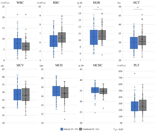 Comparison of complete blood count (CBC) indexes between cows infected and uninfected with T. orientalis. The CBC indices were red blood cell (RBC) counts, hemoglobin concentration (HGB), hematocrit (HCT), mean corpuscular volume (MCV), mean corpuscular hemoglobin (MCH), and mean corpuscular hemoglobin concentration (MCHC). White blood cells (WBC) and platelets (PLT) were also assessed.