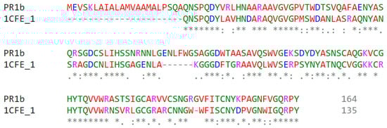 Only ICFE A (Chain A, Solanum Lycopersicum) showed a high degree of sequence identity with the PR1b domain when analyzed using BLAST. In this case, 1CFE was chosen as a template structure, and the structure was collected using the PDB database. This comparison revealed that the target sequence and the template had a sequence identity of 56%. Alignment of the target sequence and template structure should be established at a high level of identity.