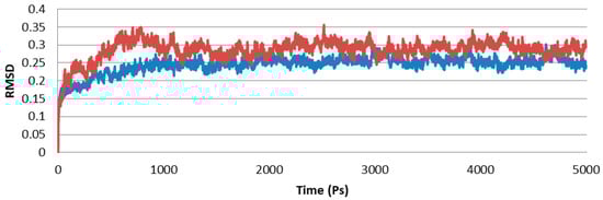 Homology modeling is used to create the initial structure of PR1b. The structure is generated using MODELLER9V7, which is further developed using molecular dynamics methods. The software generated fifty models, and the least energy of these was chosen for further analysis. The generated model was subsequently used to assist in the stabilization of the three-dimensional protein structure by molecular dynamics simulations [53,54]. The NAMD 2.8 was used to simulate generated structure using CHARMM fields. The tracking method is multiple-time stepping with long-range electrostatic determined after every two steps. This study employs Hamilton’s equations of motion to find new velocities. Data was used to produce the new model and compared it to its previously known template thermodynamic properties in terms of RMSD [55,56].