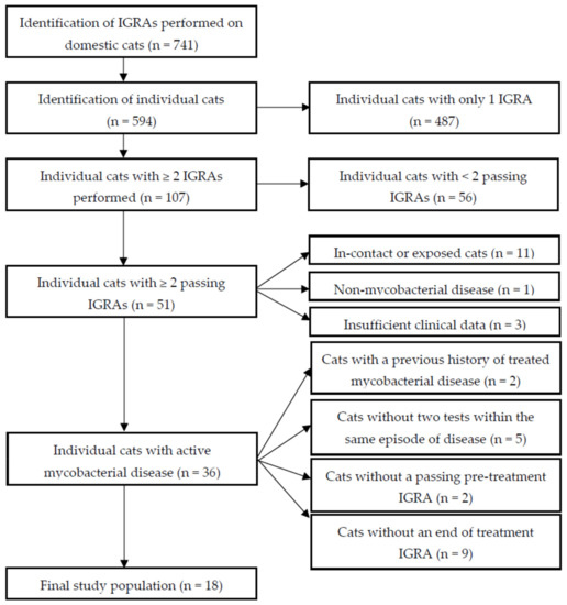 Supporting clinical data was consulted for each cat (where available) to identify those with a final diagnosis of mycobacterial disease, either (1) confirmed with culture or PCR, or (2) strongly suspected (i.e., supportive histopathology and/or ZN-positive staining of tissue biopsy material, but no culture of PCR). Cats were excluded if they had insufficient clinical records or had been tested as potential in-contact cases. Cats were also excluded if they had been previously diagnosed and treated for an incidence of mycobacterial disease prior to IGRA testing. To be included in this study, all cats had to have an IGRA performed at the point of starting treatment for mycobacterial disease, and at the point of clinical resolution of active disease when treatment was stopped.
