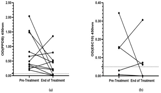 Paired average negative control corrected-OD values for pre- and end-of-treatment IGRA for (a) PPDB (n = 11) and (b) E6C10 (n = 5). The dotted line at OD 0.07 signifies the threshold for PPDB positivity. The dotted line at OD 0.05 signifies the threshold for E6C10 positivity. OD = optical density. IGRA = interferon-gamma release assay. PPDB = purified protein derivative from M. bovis. E6C10 = ESAT-6/CFP-10 antigenic cocktail.