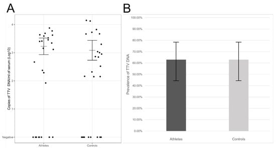 (A) TTV DNA viral loads in sera of elite athletes and controls. Represented are in the y-axis, the log10 copies of TTV DNA/mL of serum in athletes (left) and controls (right). Horizontal lines represent the geometric means and whiskers the 95% confidence interval of the viral loads calculated from the TTV DNA-positive individuals. (B) TTV DNA prevalences in sera of athletes (dark grey) or controls (light grey). The differences were not statistically significant (p > 0.05).