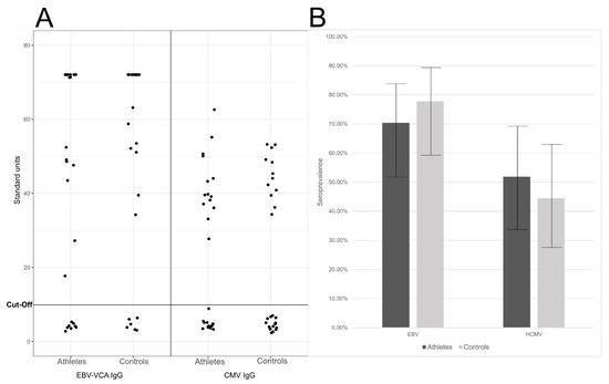 (A) EBV VCA (viral capsid antigen) IgG and HCMV IgG levels. Represented are the calculated standard units (y-axis) for each of theathletes (left) and controls (right). (B) Seroprevalences of EBV and HCMV. Represented are the percentage of IgG positive individuals (y-axis) in athletes (dark grey) and controls (light grey). The whiskers represent the 95% confidence interval of the prevalences. The differences were not statistically significant (p > 0.05).
