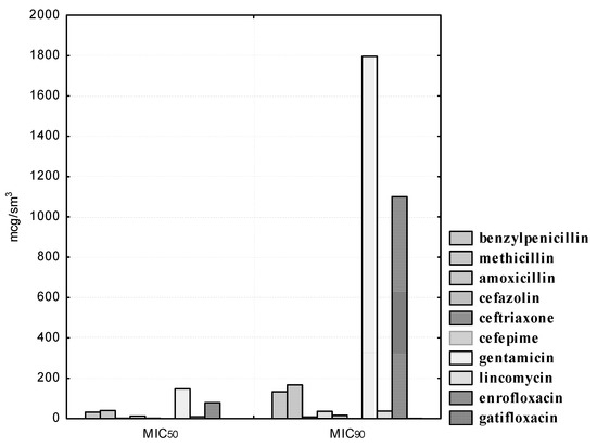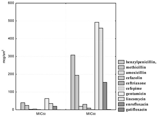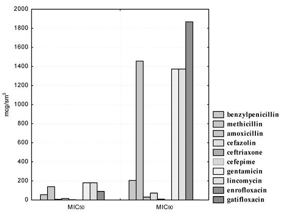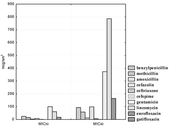 Determination of the sensitivity of isolated microorganisms to antimicrobial agents was carried out by the method of serial dilutions in nutrient agar. A total of 10 antibiotics were used for test preparations (benzylpenicillin, methicillin, amoxicillin, cefazolin, ceftriaxone, cefepime, gentamicin, lincomycin, enrofloxacin, and gatifloxacin). The minimum inhibitory concentration (MIC) of the antimicrobial agent was determined by the delay in the growth of microorganisms when compared with the control in a cup containing the smallest amount of this drug. To compare the effectiveness of antibacterial agents, the calculation of MIC50 and MIC90 was performed using the probit analysis program (Probit100, Krasnoyarsk, Russian).