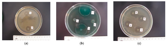 The research results given in the table indicate that the L. rhamnosus No. 26 strain was the most capable of eliminating both Gram-positive and Gram-negative microflora. Thus, this isolate inhibited the growth of coccal microflora in the range from 20.40 ± 0.50 to 30.00 ± 0.70 mm; Escherichia coli in the range from 23.40 ± 0.50 to 29.20 ± 0.86 mm (Figure 6c); Pseudomonas aeruginosa—31.40 ± 1.20 mm; Klebsiella—37.40 ± 1.32 mm; Enterobacteriaceae—27.00 ± 1.00 mm; citrobacters—15.40 ± 1.07 mm; proteus from 14.20 ± 1.49 to 16.80 ± 0.58 mm, as well as fungi of the Candida genus—22.20 ± 0.86 mm. In this case, the IIAA index was 24.6 mm. We also observed a relatively high antagonistic activity in the L. rhamnosus No. 6, L. rhamnosus No. 29 and L. rhamnosus No. 30 strains. Thus, the listed isolates inhibited the growth of Gram-positive microflora in the range from 16.40 ± 0.50 to 28.40 ± 0.92; Gram-negative bacteria, from 6.00 ± 0.70 to 32.60 ± 1.24 (see Figure 6c); and fungi of the Candida genus, from 16.00 ± 0.70 to 17.00 ± 0.70 mm. At the same time, the IIAA index for these strains was 22.4, 21.5, and 19.7 mm, respectively. It should be noted that L. rhamnosus No. 33 isolate shows the least antagonistic properties to S. intermedius, S. epidermidis, S. faecalis, P. aeruginosa, K. pneumoniae, E. aerogenes, C. freundii, P. vulgaris, P. mirabilis, and C. albicans; the growth retardation zones were 4.60 ± 0.51, 4.40 ± 0.50, 3.60 ± 0.50, 1.00 ± 0.54, 4.60 ± 0.50, 3.60 ± 0.50, 0, 0, 3.40 ± 0.50, and 1.80 ± 0.58 mm, respectively; and the AIAA index was 5.3 mm.