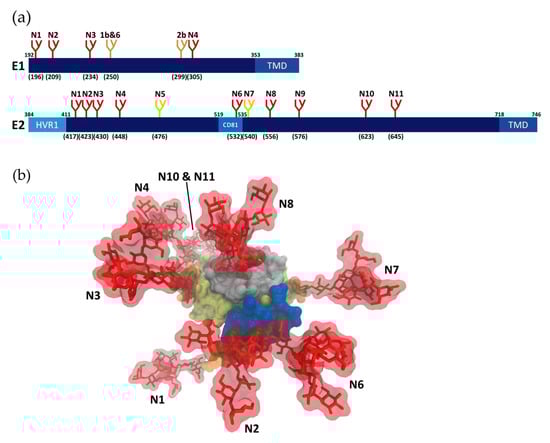 Viral envelope proteins from various human pathogens are extensively glycosylated, and viruses exploit host cell machinery to glycosylate their proteins during replication []. Viral glycans, such as those found on HCV E1 and E2, have diverse and crucial roles in virus replication and virulence [,].