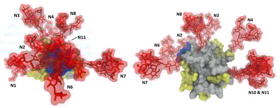 Glycan shielding of HCV E2 glycoprotein. N-glycans are extensively shielding the CD81 binding region and antigenic domains of E2 (left), whereas there are fewer shielding effects on the non-antigenic face of E2 (right).