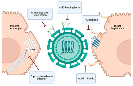 Schematic representation of HCV preventative strategies and their molecular targets. Clockwise from top: The production of antibodies in response to an immunogenic vaccine or the systemic administration of high-mannose glycan (HMG)-binding lectins could neutralize HCV. Small molecules or synthetic peptides that mimic heparan sulfate (HS) or apolipoprotein E (ApoE) respectively, could disrupt the glycan-dependent attachment of HCV preventing entry and infection of target hepatocytes. Glycosyltransferase inhibitors could inhibit the glycosylation of HCV glycoproteins, rendering progeny virions non-infectious. Created with Biorender.com.