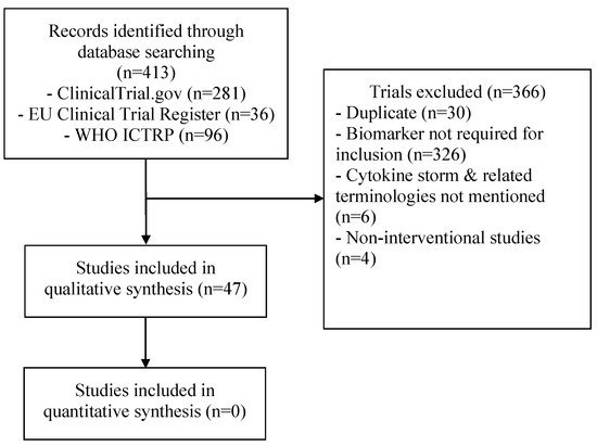 Out of 413 clinical trials screened, a total of 47 trials were included (Figure 1). The study characteristics of these studies are presented in Table 2 and Table A1, and a summary of the included parameters in the definition of the different studies is provided in Table 3. A total of 26 trials (55.3%) were in Europe, 11 (23.4%) were in North America, 2 (4.2%) were in South America, 6 (12.8%) were in Asia, and 2 (4.2%) were multicontinental. Almost all clinical trials included only adult patients and one study included patients ≥12 years, in the United States only (NCT04362813). The most commonly studied medications were as follows: tocilizumab (15 trials; 32%), anakinra (10 trials; 24.4%), corticosteroids (4 trials; 8.5%), sarilumab (4 trials; 8.5%), clazakizumab (3 trials; 6.3%), ruxolitinib (3 trials; 6.3%), emapalumab (2 trials; 4.2%), and siltuximab (2 trials; 4.2%). The following interventions were used in one study each: canakinumab, gimsilumab, itolizumab, mavrilimumab, cytokine adsorption, CytoSorb, hyperbaric oxygen, radiotherapy, collagen-polyvinylpyrrolidone, therapeutic plasma exchange, trimethoprim-sulfamethoxazole, reparixin, losmapimod, defibrotide, dornase alfa, etoposide, pyridostigmine, and zilucoplan. The inclusion criteria that were used in these studies were as follows: oxygen/respiratory criteria in 42 trials (89%), radiologic criteria in 27 trials (62%), and fever in 6 trials (19%). Other used clinical criteria were mainly shock and organ dysfunction in four trials (NCT04424056, NCT04339712, DRKS00021447, NCT04366232). Only one trial included inflammatory biomarkers without clinical or radiological criteria (NCT04423042).