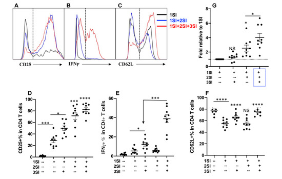 Anti-bovine CD3 was used to provide first signal (1SI), anti-bovine CD28 as second signal (2SI). Recombinant human IL-12 has been shown to effectively stimulate bovine natural killer (NK) cells [31,32], and thus was used to provide third signal (3SI). Naïve CD4+ T cells were isolated and sorted from inguinal lymph nodes (Supplementary Figure S1), and stimulated with different combinations of signals for 3.5 days, as reported previously [30]. Consistent with data from humans and mice [8], the presence of all of the three signals (1SI+2SI+3SI) led to the strongest activation, indicated by the highest level of expression of CD25 and IFNγ in CD4+ T cells (Figure 1A,B,D,E), and the highest cell expansion (Figure 1G). Although 2SI enhanced the expression of CD25 in 1SI-stimulated bovine CD4+ T cells (Figure 1D), 2SI did not significantly affect IFNγ induction (Figure 1E). On the other hand, 3SI (IL-12) was potent on IFNγ induction together with 1SI, and the presence of 2SI significantly potentiated this function of 3SI (Figure 1E), suggesting that bovine CD4+ T cells respond to three signals in a way similar to CD4+ T cells in humans and mice [8]. CD62L is usually expressed at high level in naïve CD4+ and CD8+ T cells, which plays a pivotal role in controlling naïve T cells to traffic to and from secondary lymphoid tissues [10]. Once T cells are exposed to antigen stimulation in lymph nodes, the expression of CD62L decreases, which enable the activated T cells to migrate to the site of infection to perform their functions. Consistent with their human and murine counterparts [5,33]. CD62L in bovine CD+ T cells was significantly downregulated by anti-CD3 stimulation (1SI) (Figure 1C,F). However, IL-12 enhanced the expression of CD62L irrespective of 2SI (Figure 1F), suggesting CD62L expression in bovine CD4+ may be sensitive to IL-12 regulation, similar to the effects of IL12 on CD4+ and CD8+ T cells in mice [34,35].