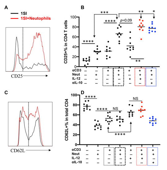 We recently reported that bovine neutrophils could activate bovine CD4+ T cells together with 1SI and precluded the requirement for additional costimulation [30]. The potential synergistic effects of neutrophils and IL-12 were accessed by stimulating bovine CD4+ T cells with 1SI in the presence or absence of IL-12 and/or neutrophils in different combinations. The presence of neutrophils enhanced CD25 expression in 1SI-stimulated gated CD4+ T cells (Supplementary Figure S3, Figure 3A,B, thick black box), consistent with our previous report [30]. The presence of both neutrophils IL-12 led to significant upregulation of CD25 in 1SI-stimulated CD4+ T cells compared to that of either alone (Figure 3B, red box), suggesting synergistic activity by IL-12 and neutrophils. Consistently, IL-12 enhanced CD62L expression only in the presence of neutrophils (Figure 3C,D). In addition, the presence of neutrophils, with or without IL-10, did not affect the percentage of CD62L expressing cells (Figure 3D, blue box), suggesting that the synergy between neutrophils and IL-12 is restricted to CD4+ T cell activation and may not necessarily affect their migration.