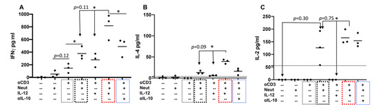 Neutrophils and IL-12 synergistically stimulate the secretion of cytokines by activated bovine CD4+ T cells. Supernatants from stimulated CD4+ T cells were harvested 3.5 days after stimulation and quantified for Th1 cytokine IFNγ (A), Th2 cytokine IL-4 (B), plus IL-2 (C), using a cytokine array [36,37]. Thin black: αCD3 only; thick box: Neutrophils+αCD3; red box: Neutrophils+αCD3+IL-12; blue box: Neutrophils+αCD3+αIL-10. Data were expressed as mean of three cattle samples and were analyzed by one-way ANOVA with Tukey’s Multiple Comparisons Test. Asterisks indicate statistical significance. * p < 0.05. NS: not significant. Dotted lines indicate limit of detection (LOD) for each cytokine.