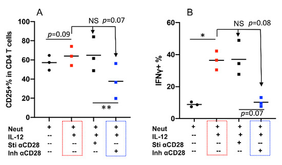 Naïve bovine CD4+ T cells were stimulated by 1SI plus neutrophils with or without IL-12 in the presence or absence of stimulatory anti-CD28 (Sti αCD28) and inhibitory anti-CD28 clone#TE1A (Inh αCD28). Indeed, Clone#TE1A dampened neutrophil and IL12 synergy (p = 0.07), as shown by reduced CD25 expression and IFNγ production (p = 0.08), whereas stimulatory anti-CD28 (Sti αCD28) had essentially no effect (Figure 6A,B, red and blue boxes). These data suggest that the synergy of neutrophil and IL-12 can be regulated, such as through inhibition by specific clone of anti-bovine CD28 TE1A.