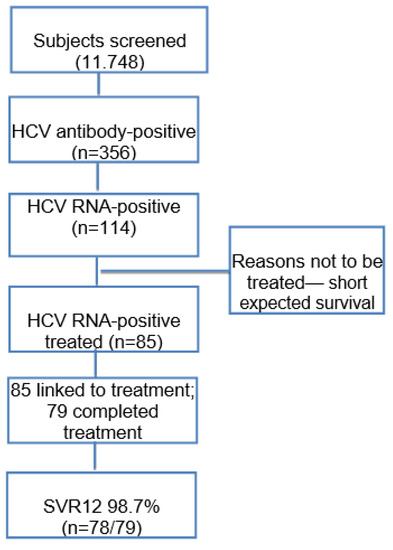 Primary outcome measures included the performed hepatitis C antibody tests and HCV RNA assessment. Patients with positive HCV RNA results and a reactive antibody test were subjected to genotype assessment and were offered treatment with a pangenotypic single-pill combination of SOF/VEL for 12 weeks, with or without ribavirin according to the severity of the liver damage. Sustained virological responses 12 months after the end of treatment (SVR12) and at the post-treatment follow-up were considered secondary outcomes.