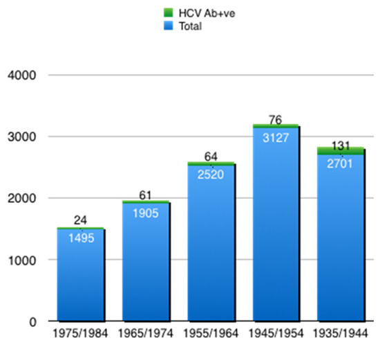 The study population included 11,748 subjects (Figure 1), of whom the majority were male (53.50%). The mean age was 64.6 ± 12.1 years. The number of patients admitted was partially affected by the COVID-19 pandemic: there was a 36.10% reduction in the total number of patients admitted to the hospital, across many different diseases and conditions, in comparison to the previous year. Overall, 356 (3.03%) had a positive HCVAb result (Table 1). The rate of HCVAb-positive males was significantly higher than that of females (60.41% vs. 39.60%, p = 0.047). The number of positive HCVAb results with respect to age cohorts is reported in Figure 2. The positivity rate increased with age, confirming the already-known birth cohort effect associated with HCV infection in Italy [13,15]. For subjects born from 1935 to 1944, the 4.8% HCVAb positivity rate was significantly higher than for subjects born 10 or 20 years earlier (p = 0.0001), with prevalence rates of 2.4% and 2.5%, respectively. An increment of 3.20% in the rate of HCVAb positivity was observed among subjects of birth cohort 1965–1974. This was lower than the rate observed among the oldest cohort (p = 0.006), but not different from the peaks observed among people born between 1945 and 1954 or 1955 and 1964. Overall, 271 of 356 (76.1%) HCVAb positive patients were 56 or older (Table 2).