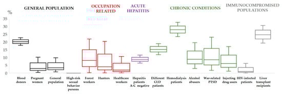 - Haffar, S.; Bazerbachi, F.; Leise, M.D.; Dillon, J.J.; Albright, R.C.; Murad, M.H.; Kamath, P.S.; Watt, K.D. Systematic review with meta-analysis: The association between hepatitis E seroprevalence and haemodialysis. Aliment. Pharmacol. Ther. 2017, 46, 790–799. [Google Scholar] [CrossRef] [PubMed]
