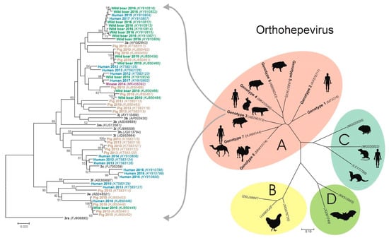 - Smith, D.B.; Izopet, J.; Nicot, F.; Simmonds, P.; Jameel, S.; Meng, X.J.; Norder, H.; Okamoto, H.; van der Poel, W.; Reuter, G.; et al. Update: Proposed reference sequences for subtypes of hepatitis E virus (species Orthohepevirus A). J. Gen. Virol. 2020, 101, 692–698. [Google Scholar] [CrossRef]