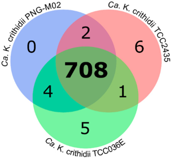 Sharing of orthologous groups of proteins encoded in the genomes of the three Ca. K. crithidii strains.